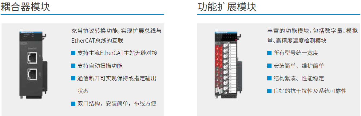 支持EtherCAT总线,可自由搭配功能模块组成模块化I/O系统,由耦合器充当协议转换功能,实现扩展总线与EtherCAT总线的互联。
